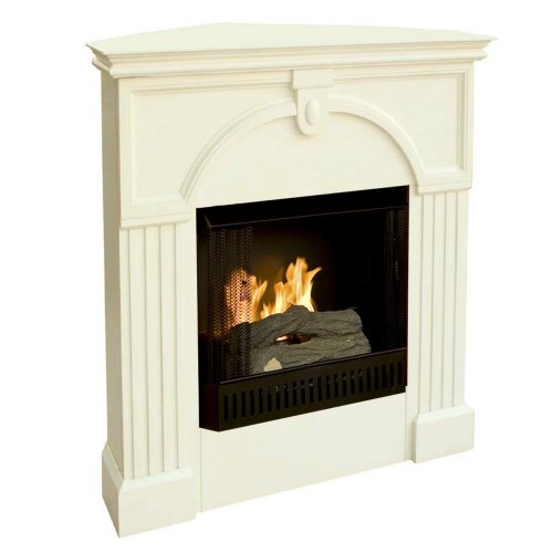 This furniture arrives unassembled. Gel fuel cans sold separately. Inspired by traditional Greek architecture, this antique white corner fireplace uses ribbed columns to enclose the firebox and support the decorative arch. Capping everything off is a large mantelshelf with crown molding. Portability and ease of assembly are just two of the reasons why our fireplace mantels are perfect for your home. Requiring no electrician or contractor for installation allows instant remodeling without the usual mess or expense. In addition to your living room or bedroom, try moving this fireplace to your dining room for romantic dinners or into the master bathroom for a relaxing fireside bath. Use this great functional fireplace to make your home a more welcoming environment. EF5158G Features: Mantel supports up to 85lbs. Compliment your media room with a ventless fireplace below your flat screen television None of the mess of a wood burning fireplace FireGlo Gel Fuel Snaps and Crackles like real wood (fuel not included) Emits no smoke, odor, or ash Holds up to 3 cans of gel fuel simultaneously for a full bodied 6-8" flame Each can of FireGlo produces up to 3000 BTU Supplements heat to save on energy consumption Includes Firebox, cement log, faux coal cinder, and screen kit Finish: Antique White Dimensions: 42.25"(W) x 29.25"(D) x 42.25"(H) WARNING: positioning anything on top of your fireplace mantel poses a degree of risk especially in the case of electronic appliances or equipment. If you elect to display a television we recommend that it be a slim profile flat-screen and that it be positioned away from the front edge of the mantel where there is a degree of heat generated from the firebox. It is also recommended that any flat screen TV be secured to the wall behind it for added safety and security. Manufacturer assumes no responsibility for items placed on top of a fireplace mantel.